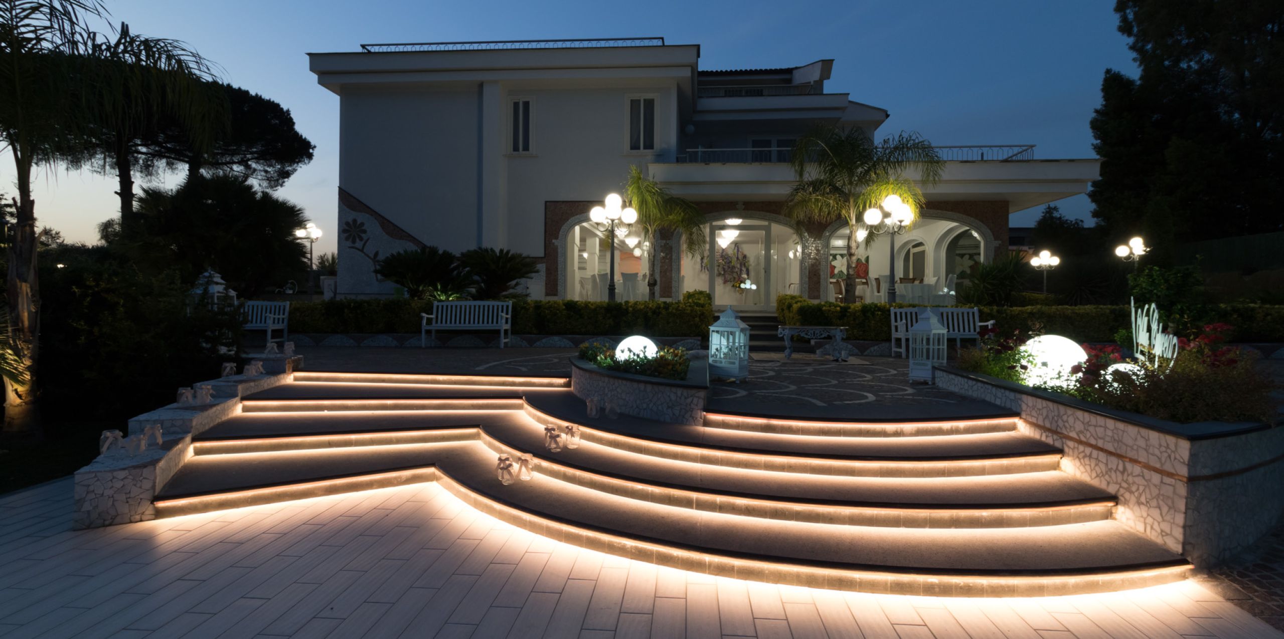 Led Italy has designed the lighting scenario of this wonderful villa taking care of the exterior details, such as the main staircase at the entrance, the fountain and the swimming pool.